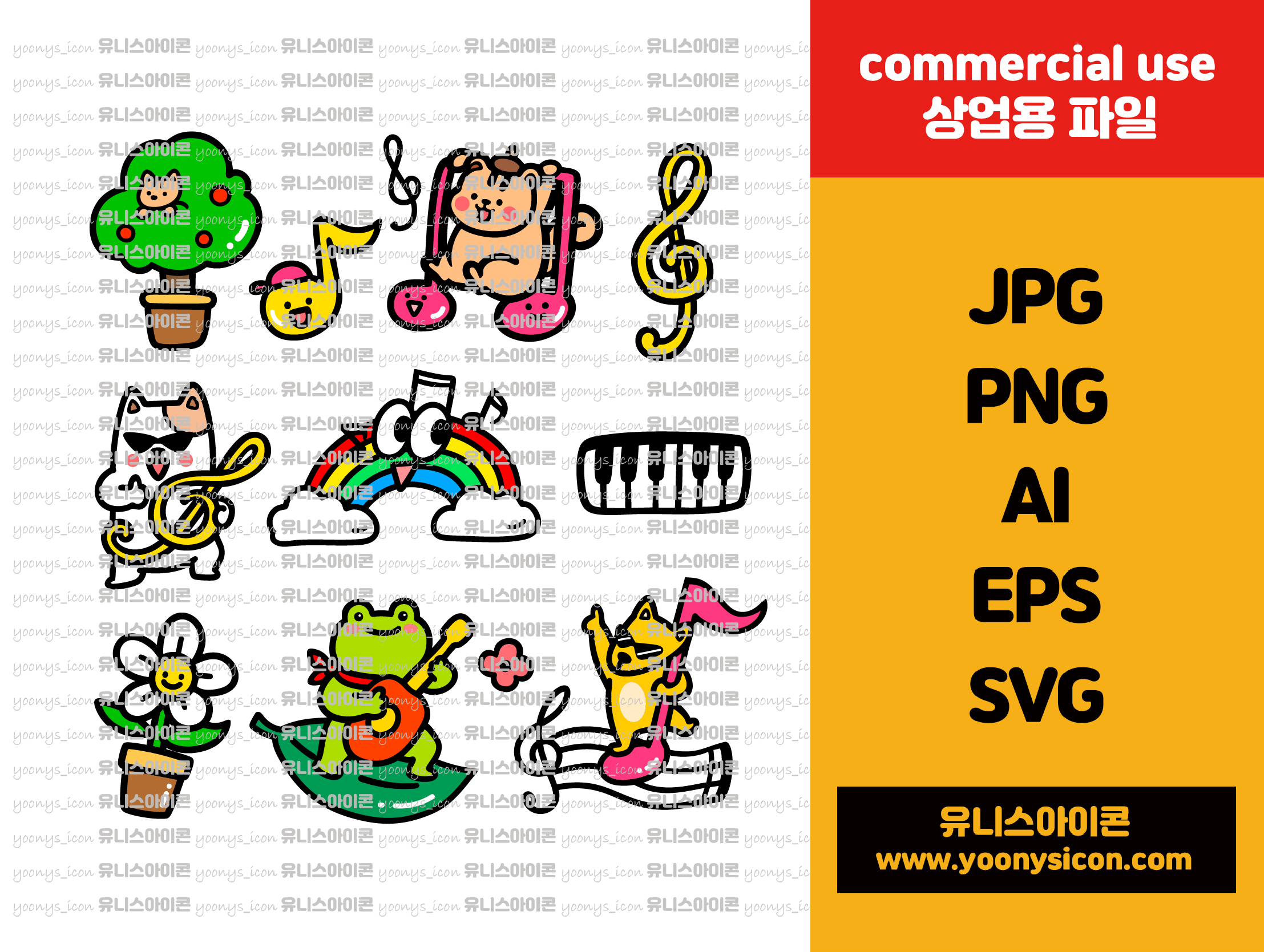 위의 항목 외에 풍선, 토퍼, 굿즈, 의류, 자수, 현수막, 백드롭 판넬, 감사패, 커스텀 스티커 상품에 상업적 사용 가능합니다.